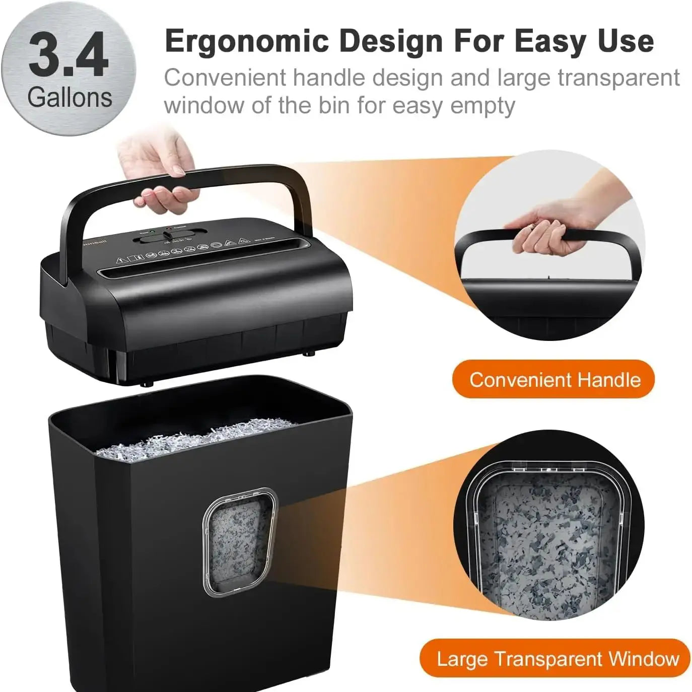 Featuring a built-in handle and space-saving dimensions, this shredder fits effortlessly in tight spaces. The 3.4-gallon transparent bin provides clear visibility for easy maintenance and includes a convenient waste disposal mechanism.