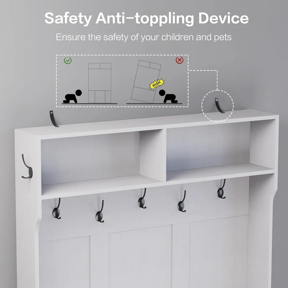 - Sturdy Structure: Crafted from high-grade wood, this hall tree with storage boasts a robust structure that ensures long-lasting stability and durability. The anti-tip device securely anchors it to the wall, preventing any tilting or wobbling. This feature significantly reduces the risk of accidental tipping, making it ideal for homes with children or pets