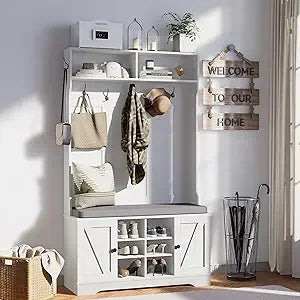 - 4-in-1 Design: This hall tree combines a coat rack, bench, shoe storage, and display area. The hooks keep coats and bags organized, while the bench is ideal for changing shoes. The built-in storage compartment conceals small-sized shoes and other items, ensuring a tidy entryway. The top shelf provides a perfect spot for decor and plants, making this hall tree both functional and stylish