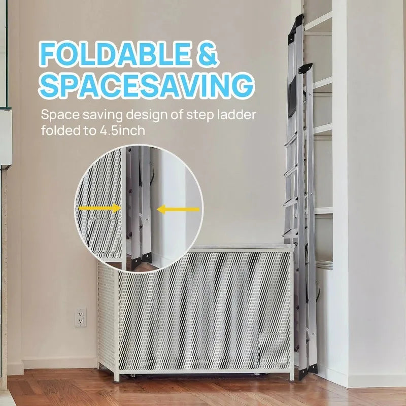 This portable foldable ladder serves as a great help and takes up little room. Its design determines that the ladder will not shake during use, and the two-way anti-skid pad can easily handle various family floors, making it safe and ideal for many occasions.