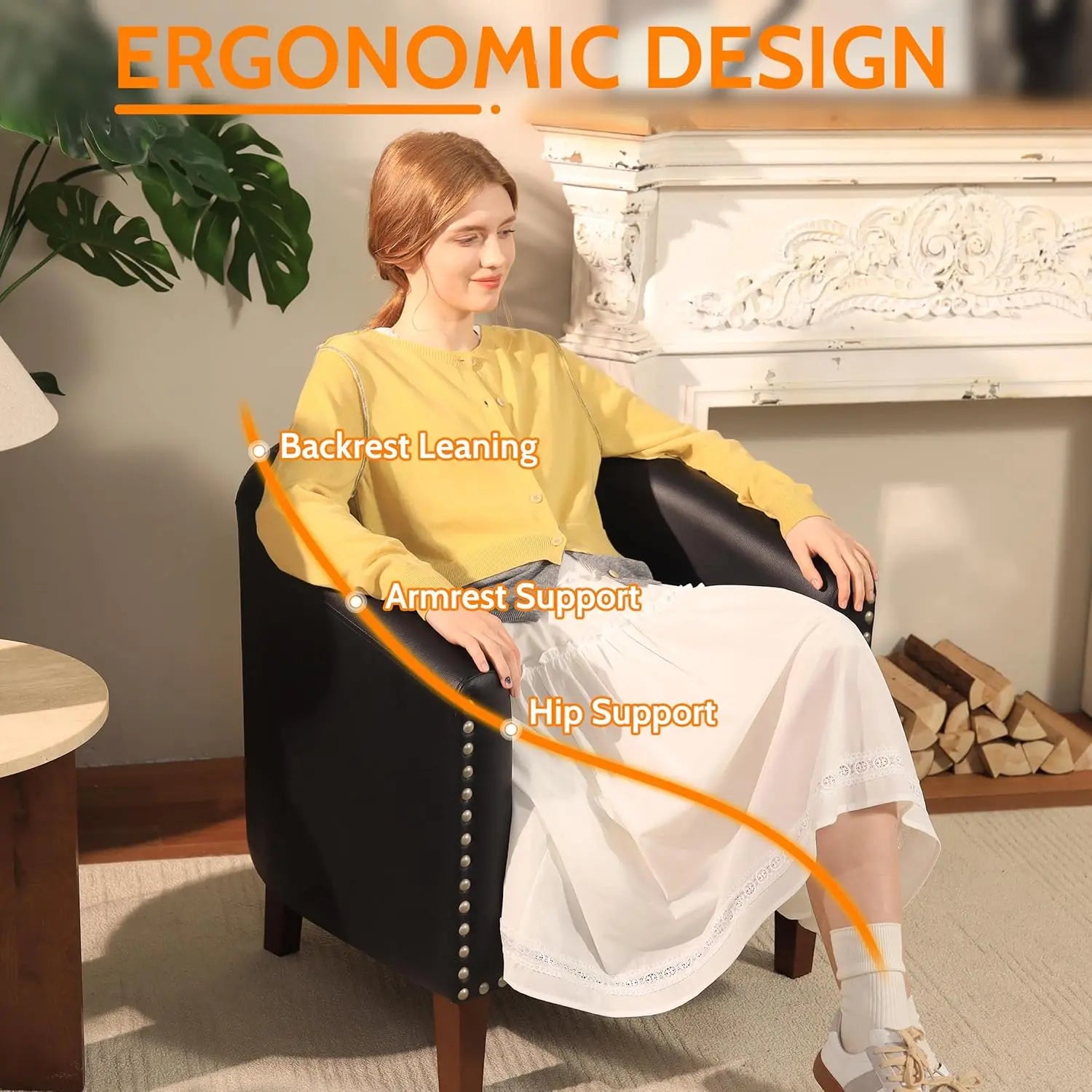 - 【Sturdy Construction】 Crafted with a sturdy FSC-Certified wood frame and four solid FSC-Certified wood legs, this barrel chair is built to last. The black faux leather upholstery is not only easy to clean but also adds a luxurious feel to the overall design. With its solid construction, you can enjoy this comfy arm chair for years to come.
