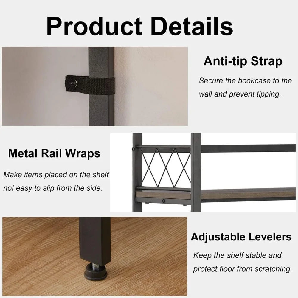 - 【Stable and Thoughtful Design】 Additional support rod under each shelf increase its weight capacity greatly to make each layer hold up to 130 lbs easily. This wood bookcase also comes with 4 pcs adjustable feet, they can keep this book case standing stable on uneven floor and defend wood floor from scratching. Besides, the metal rails wraps around shelves to guard stuff from sliding off and anti-tip devices also help to avoid this shelf from unexpected tipping.
