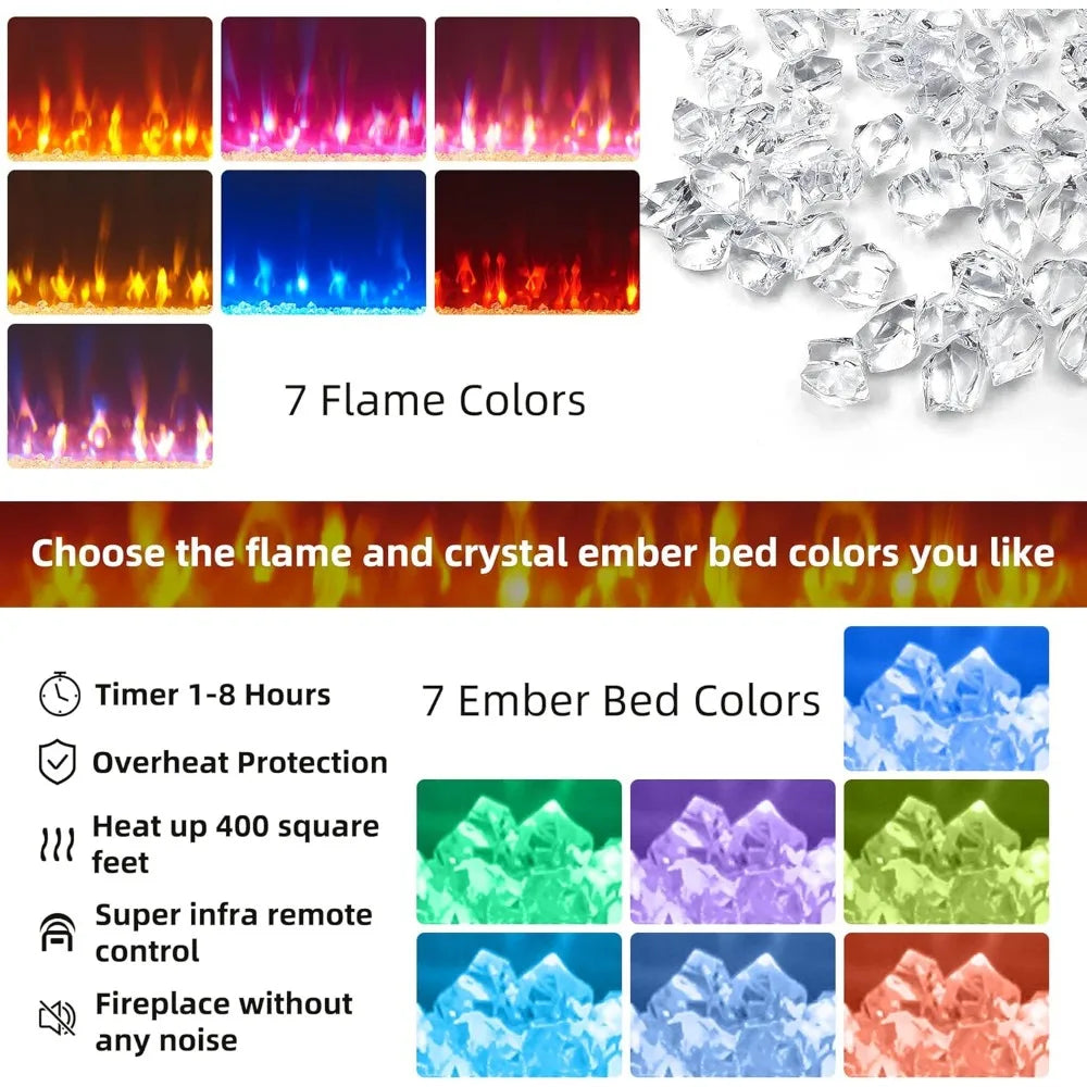 - 【Better Customized Ambiance】7 adjustable flame color options, also 7 adjustable LED lighting colors on the ember bed and cabinets, providing a captivating atmosphere tailored to your mood, decor, or preference, and the shining crystal will highlight the inherent beauty of each realistic fire. Then all these functions could be finished easily by the super infra remote control
