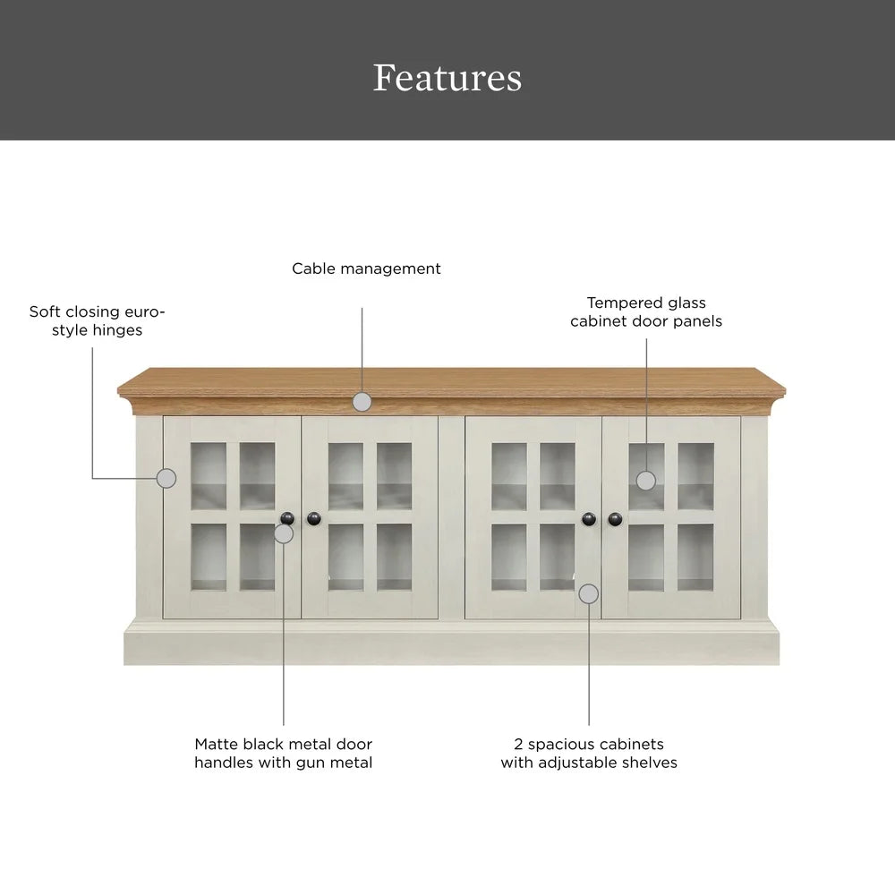 Fits most flat panel TVs up to 70 inch 2 spacious cabinets with adjustable shelves Tempered glass cabinet door panels Matte black metal door handles with gun metal finish Soft closing euro-style hinges Multi-purpose storage solution can be used as a media console, accent cabinet or dining buffet Cable management cutaways Assembly required Available in multiple finish options: Black and White Dimensions: 59. 75 in W x 20 in D x 25. 25 in (151. 8 cm x 50. 8 cm x 64. 1cm) Packaging Dimensions: 65. 5 in x 25. 25 in x 9. 125 in Model# BHF336158813001, BHF336158813002