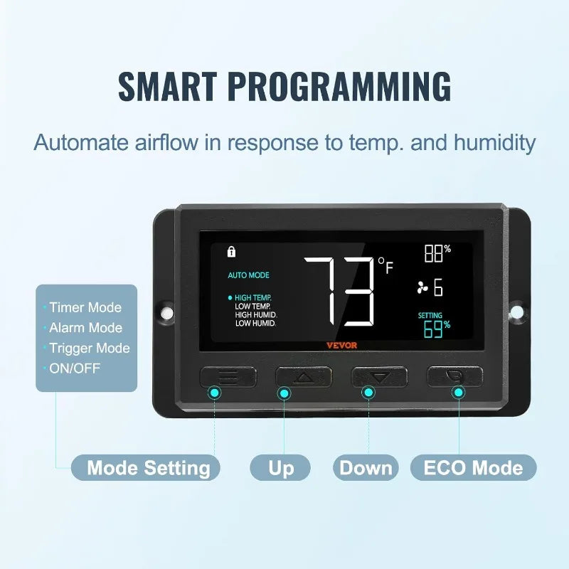 - Smart Programming: We are equipped with an intelligent controller! Not only do you have temperature and humidity triggers, but it also allows you to set up to 10 speeds that will respond to changes in them. You won't miss a thing and will always be ready to adapt! There are multiple modes, allowing you to adjust as you wish. Timer and alarm modes are available on demand.