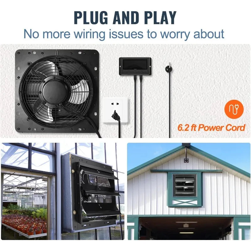 - Plug and Play: Get ready to fly through the installation process! Our wall exhaust fan comes fully assembled and ready to install right out of the box. Includes 4 bolts. You're ready to go by connecting the 6.2 ft power cord. No more worrying about wiring! Works well for garages, workshops, chicken coops, windows, attics, greenhouses, etc.