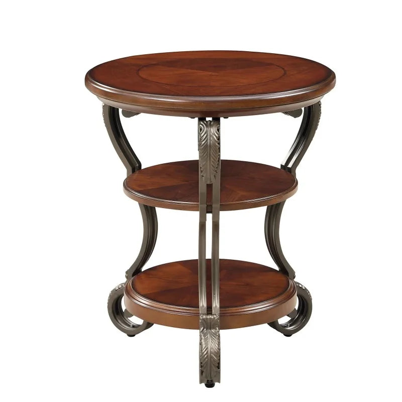 The ornate designs supporting and decorating each accent table will surely update any living space. Scroll detailing found along the metal legs creates a sophisticated appeal, drawing attention to the open shelves below.