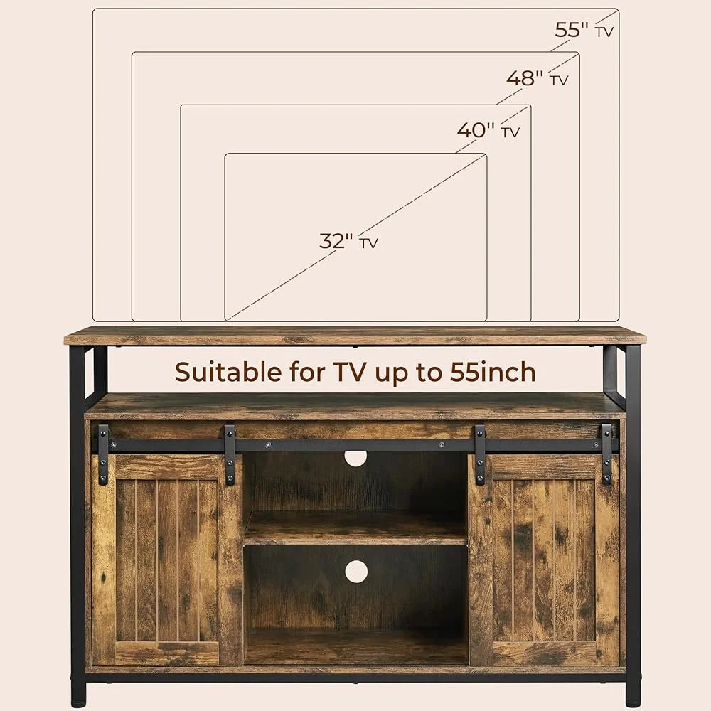 About this item TV Console Table for 55″ TVs: Measuring 120 cm L × 40 cm W × 77 cm H / 47. 5″ L × 16″ W × 30. 5″ H, this sliding barn door TV storage cabinet suits TVs up to 55-inch. While, a slightly larger TV is also acceptable if it is not heavier than 50 kg/ 110 lb Cabin-Inspired Barn Doors: A pair of sliding barn doors highlight this media console table, endowing it with the presence of a soothing rustic cabin in a restful village. In addition to the visual design, such a door also facilitates item access and storage Robust Frame: The heavy-duty veneered iron is selected to craft the frame of this storage TV cabinet. Combined with quality particleboard, this TV console table features excellent weight capacity. Max weight capacity: top: 50 kg/ 110 lb; big shelf: 30 kg/ 66 lbs; each small shelf: 10 kg/ 22 lb Adjustable Shelves: The shelves are designed adjustable. By means of changing the height of the partitions, which have 3 available choices: 7. 2’’, 9. 7’’, 12. 2’’, items of different sizes can be well accommodated User-friendly Assembly: Assembly is required. But don't worry about it. A clear, step-by-step instruction and an accessory kit are included to ensure that you can put this TV stand together smoothly within 1. 5 hour